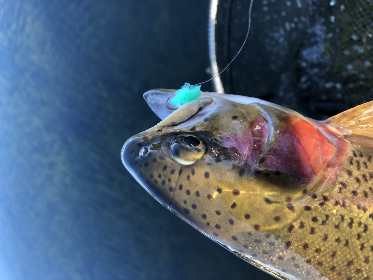 After a few more cats the wind was making it difficult to fish the indicator and I was missing a few fish so it was time for a change. Switching to the fast glass and olive worm casting a full line past the island I let the line sink for 10 seconds before starting a very short sharp retire doing very fast 6-inch pulls creating lots of movement in the worm that the trout seem to love. The takes are very aggressive and I do really enjoy this style of fishing in the winter. First cast half back and I had a very hard take and the first fish was hooked on the worm. This was the best fish of the day a fully fined rainbow of about 2 and half pound. Due to the fishery mainly being catch and release the quality of the fish is amazing perfect proportions and fully finned trout. After covering lots of different parts of the lake I was surprised not to get any more takes. A change was needed, as happens now again and I got a lucky fish winding in another cracking rainbow. The wind had eased and there were now a few fish rising. I decided to try the MM (Mojito Mitten).