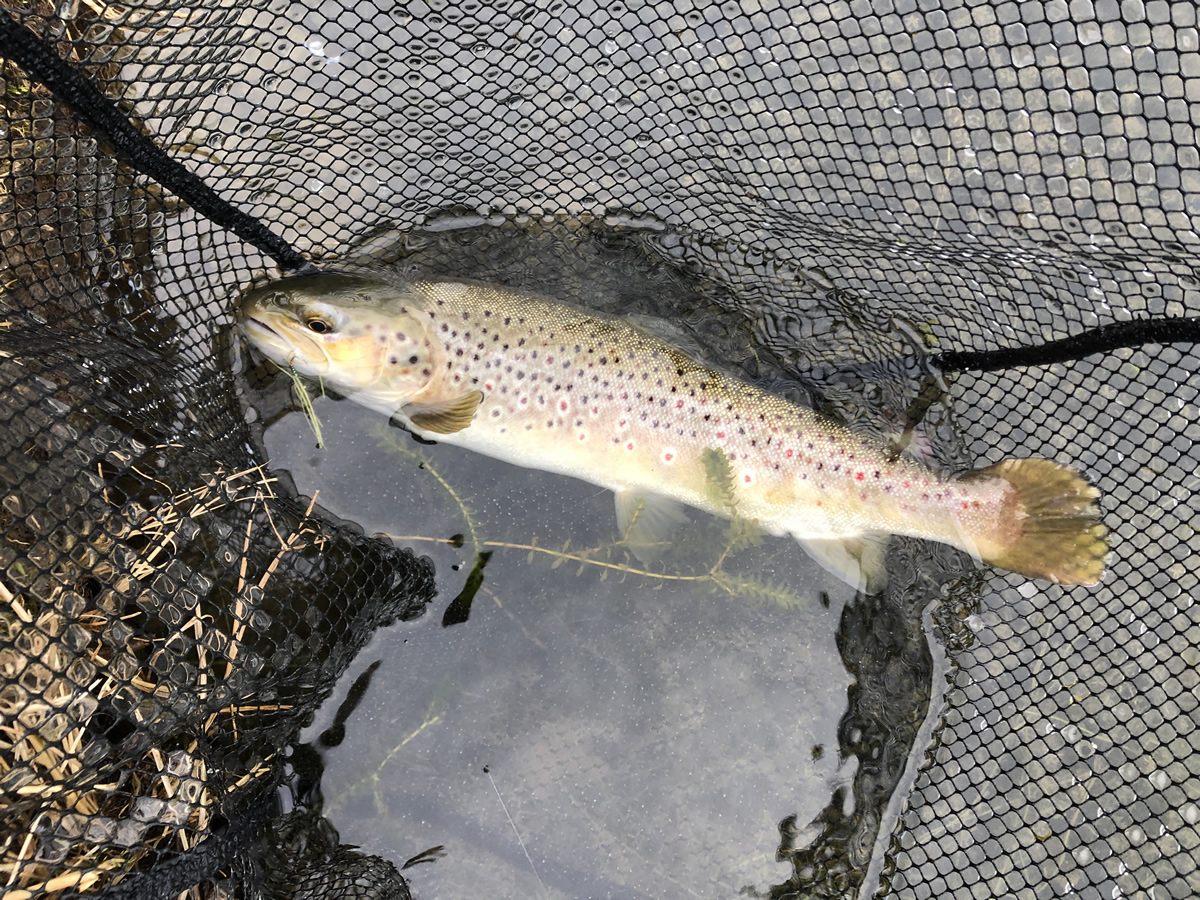 I headed down to deep pool where martin had suggested may be a good spot for some Blue trout. Spending about 30 mins here trying lots of different fly’s and methods for only the odd pull. I moved onto Farm pool, the weather was now changing the blue skies had now gone dark. A long cast down the middle of farm on the fast glass with the olive red tag worm and as I was counting down the line went tight and fish number 7 was hooked. After a dogged fight I netted a beautiful out of season brown trout with red spots dotted all the way down its side. With the weather now changing and rain starting I thought it was a good time to call it a day. Only a short 2 and half hour session but what great fun and just the right amount of time to be out fishing on a cold day.