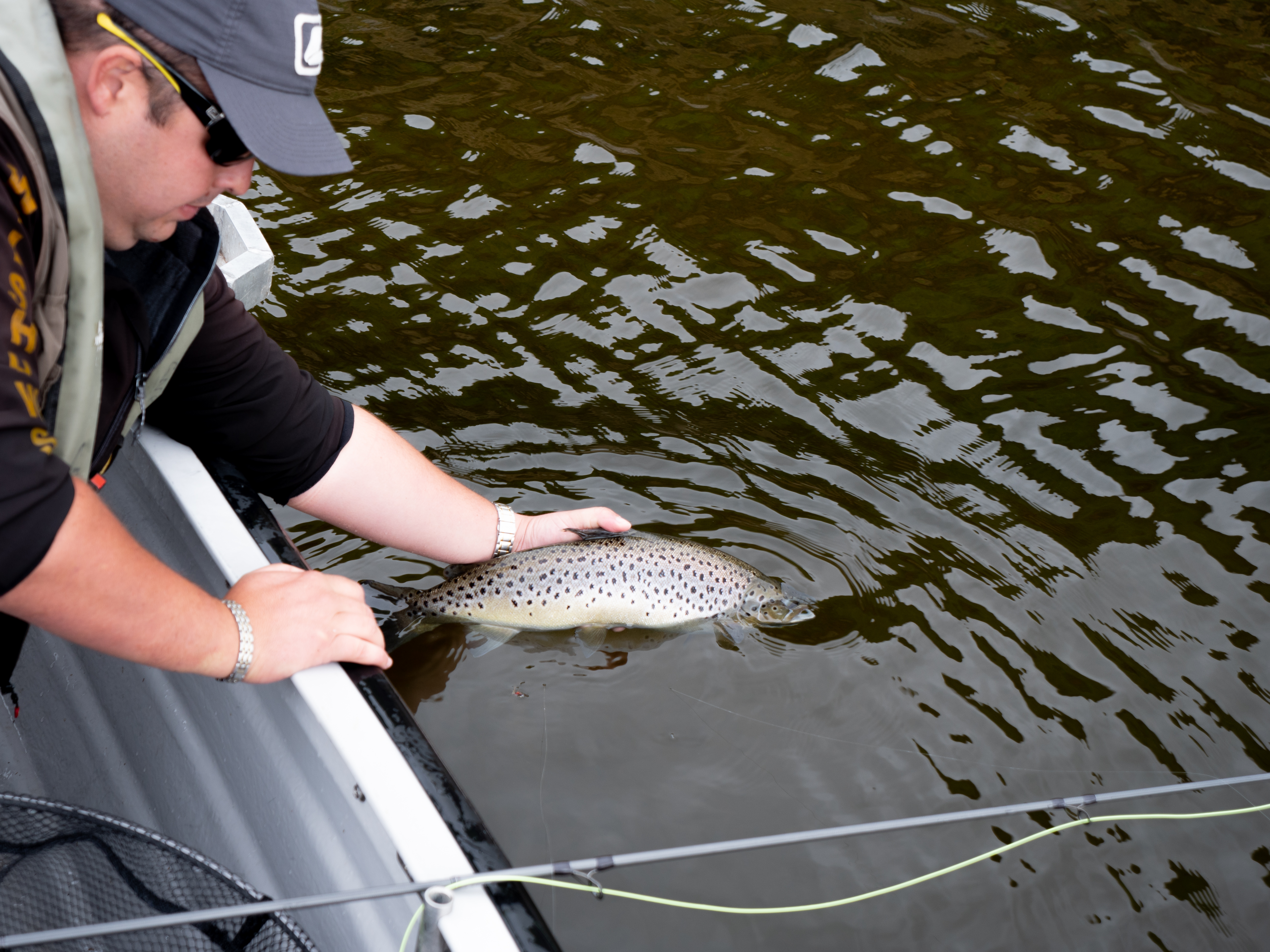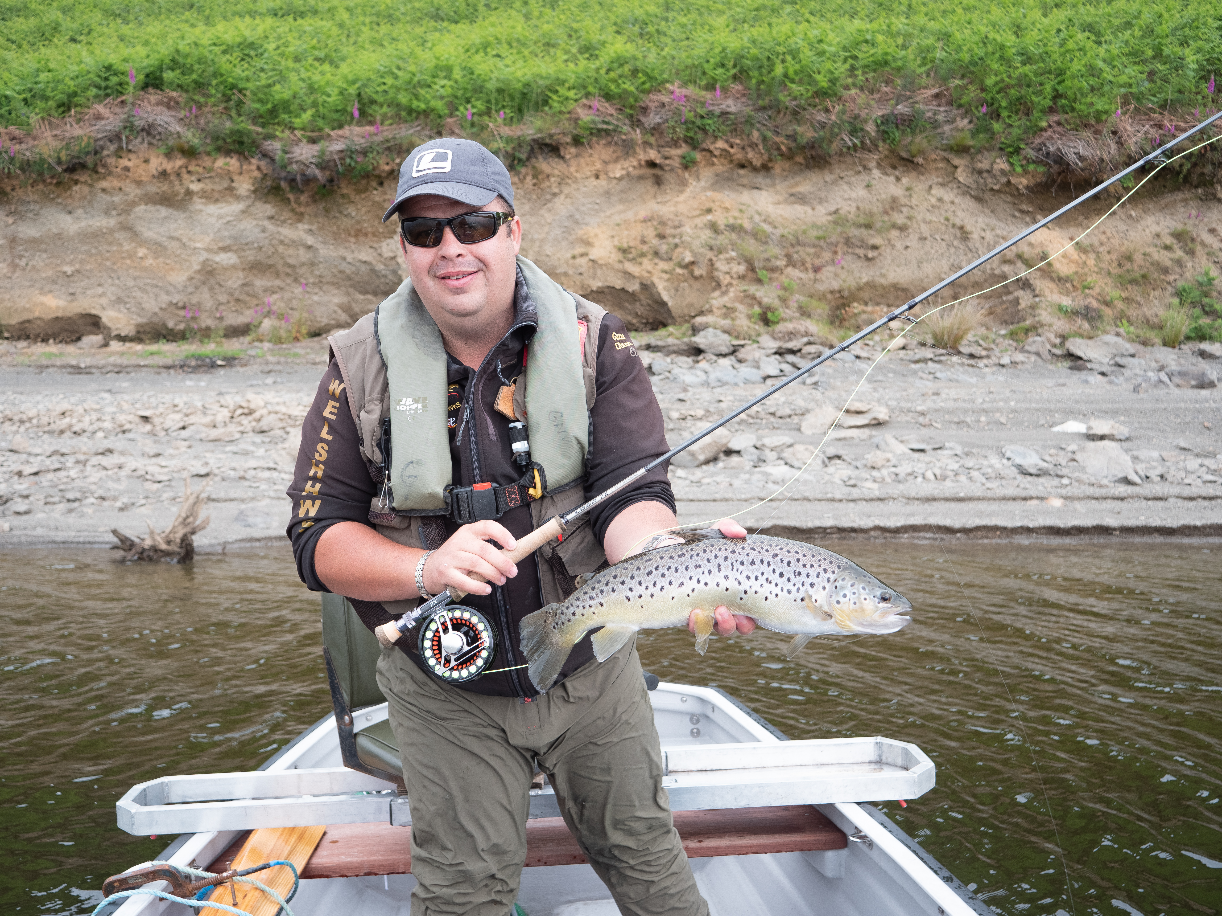 After the first drift I decided to change the flies. I put a Brown Hogg Daddy on the point, a new black and red Midas pattern I am working on in the middle and a Orange Deer Hair Daddy on the top dropper. So back up for a re drift fishing the angle to the bank and scanning for rising fish, I spotted a sipper. Covering the fish fast and accurately it slowly broke the surface, did a lovely head tail over the middle dropper and it was hooked. This was definitely a brownie, I could tell by the dogged fight and it felt like a good one. For a powerful fast action rod the 7X was bending right through and cushioning the head thumps well. After a good fight I netted a great looking Brown in perfect condition. The fishing was frantic with nearly every cast having interest. If this had been a comp I would have stayed here all day and carried on doing these long drifts. I had seen good numbers of fish rising the day before when out on patrol around popys hole and really fancied trying there. I started the drift right at the limit of fishing. It seemed very quiet with very little surface activity. Then out of the blue 2 fish came over my top dropper and point flu lucky for me the point fly fish came off and I was left to play the fish on the top dropper. This was a real old fish with a shovel for a tail. The fishing was steady all the way to the dam wall, nothing crazy but a good head of older fish.