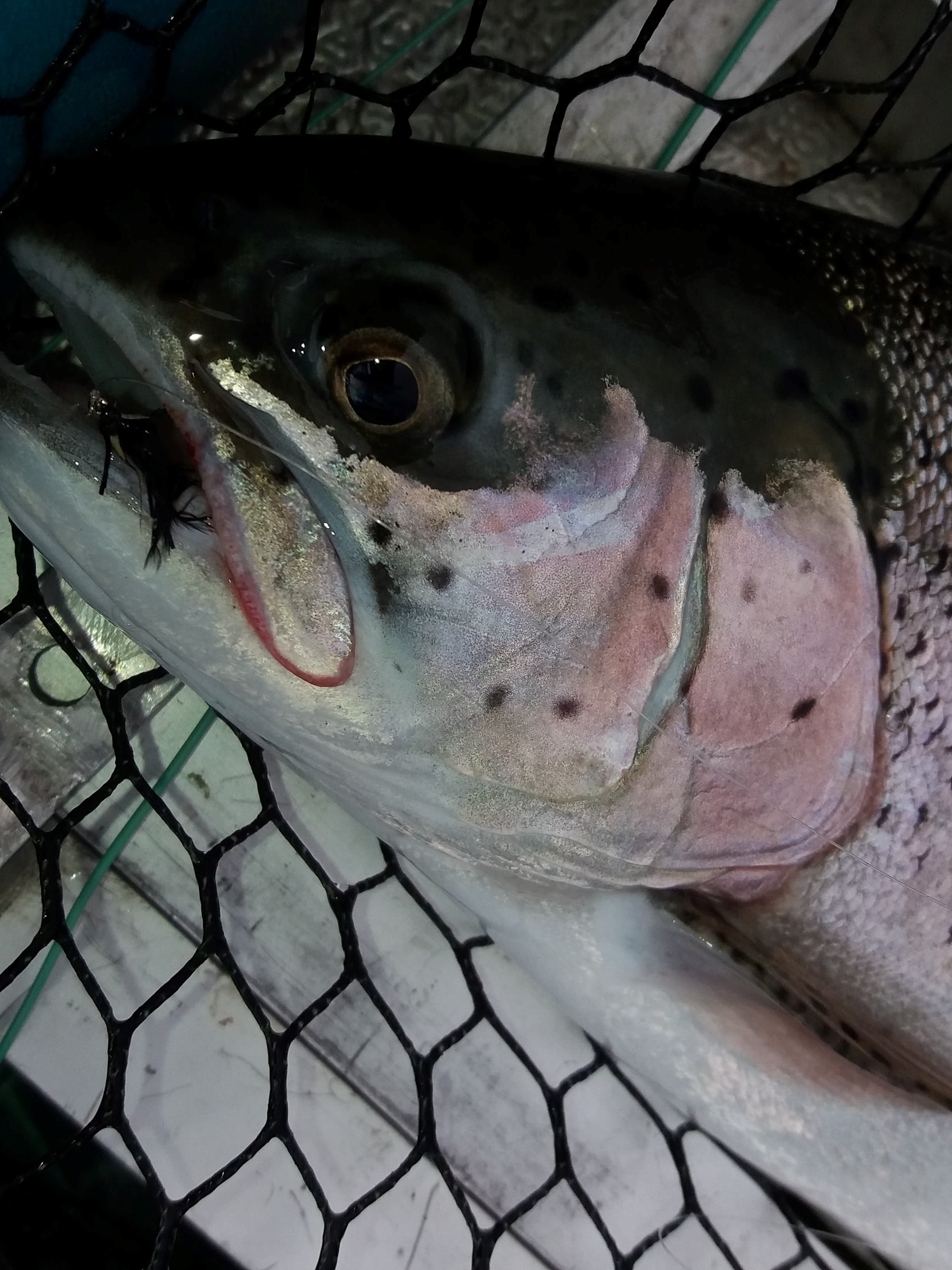 Within 15min I had hooked and lost my first fish on the booby, and immediately thought ‘oh no…not the first!’ By 11am I had hooked 5 fish and boated 3, one on the booby and 2 on the corm. Before we decided to move from Mallings to Gateside I had 5 fish to the boat, so the pressure was off and I could relax a little and start to enjoy my fishing! We moved against the ropes in Gateside were my partner picked up and moved a couple of fish. I hooked and boated 3 quick fish fishing completely static allowing my flies to descend slowly through the water column. One of these fish was not playing fairly and headed immediately beneath the rope at the cages. I could see him rolling on the surface on the other side while my line was heading down to the rope! At this stage I was more worried about my flies than the fish! I could see the booby in the scissors so my only option to start the engine and move over to the rope and try to drag the fish down beneath the rope without catching the droppers…would that be possible? Rod down into the water was far as I could reach and start bullying this fish to the right side of the rope…the fish began to move and swim beneath the rope and as I was waiting for flies to catch, but no, the fish was clear and on my side…I motored into the middle of the bay away from the rope and landed the fish…I knew then my luck was in!