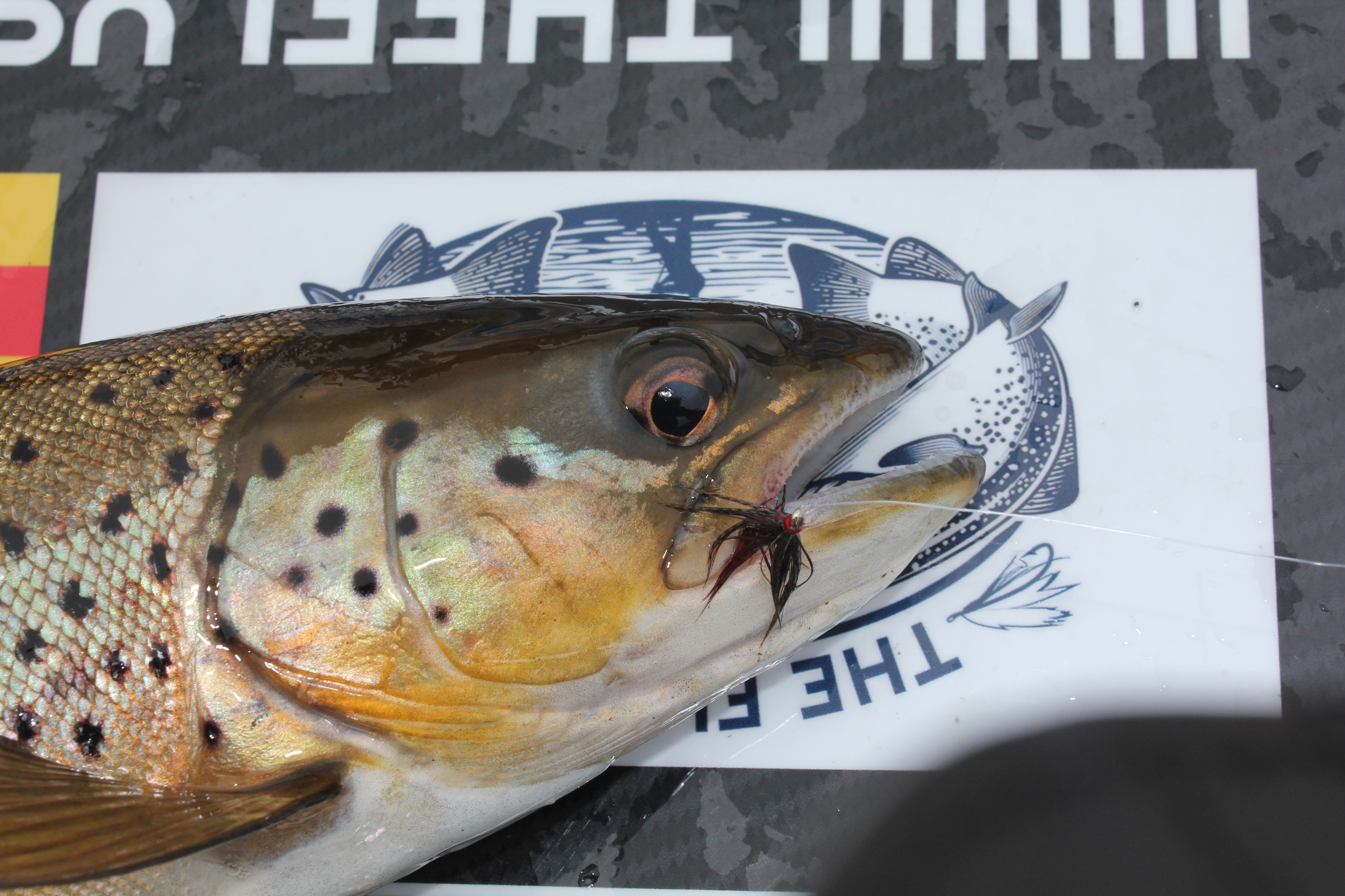 Long slow steady pulls to get the flies down seem to my preferred approach as a hooked into my next fish on the olive dabbler. The fish took whilst bring the team of flies up towards the hang, when I received a powerful pull back. After a couple of aerobic jumps, it was in the net and safely returned for someone else to enjoy.